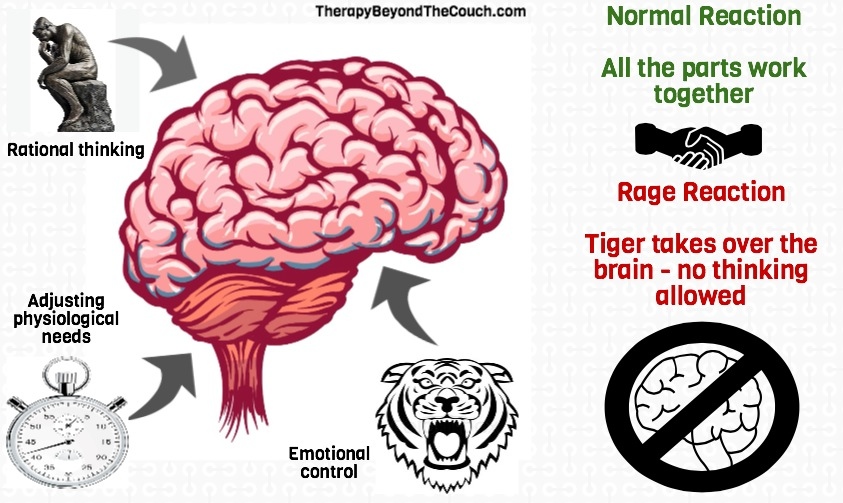 What you describe as blinding rage is often referred to as Amygdala Hijack. When you look at the infographic below, you will see the three parts of the human brain. The hind brain (the stopwatch) is the oldest part of our brain which takes care of our physiological needs like hunger, body temperature, etc. Next, we evolved the Limbic Brain (the tiger) which contains our emotional centre, followed by the newest part of our brain – the Neocortex (thinking man in infographic) which deals with rational thinking, and human language. Normally, the Limbic Brain (emotional centre) and the Neocortex (rational thought) work together and negotiate reactions to the outside world. But during a rage reaction, the Limbic Brain hijacks the system and the Neocortex is rendered useless. It is as if you return to being a wild animal defending yourself against a vicious attack.